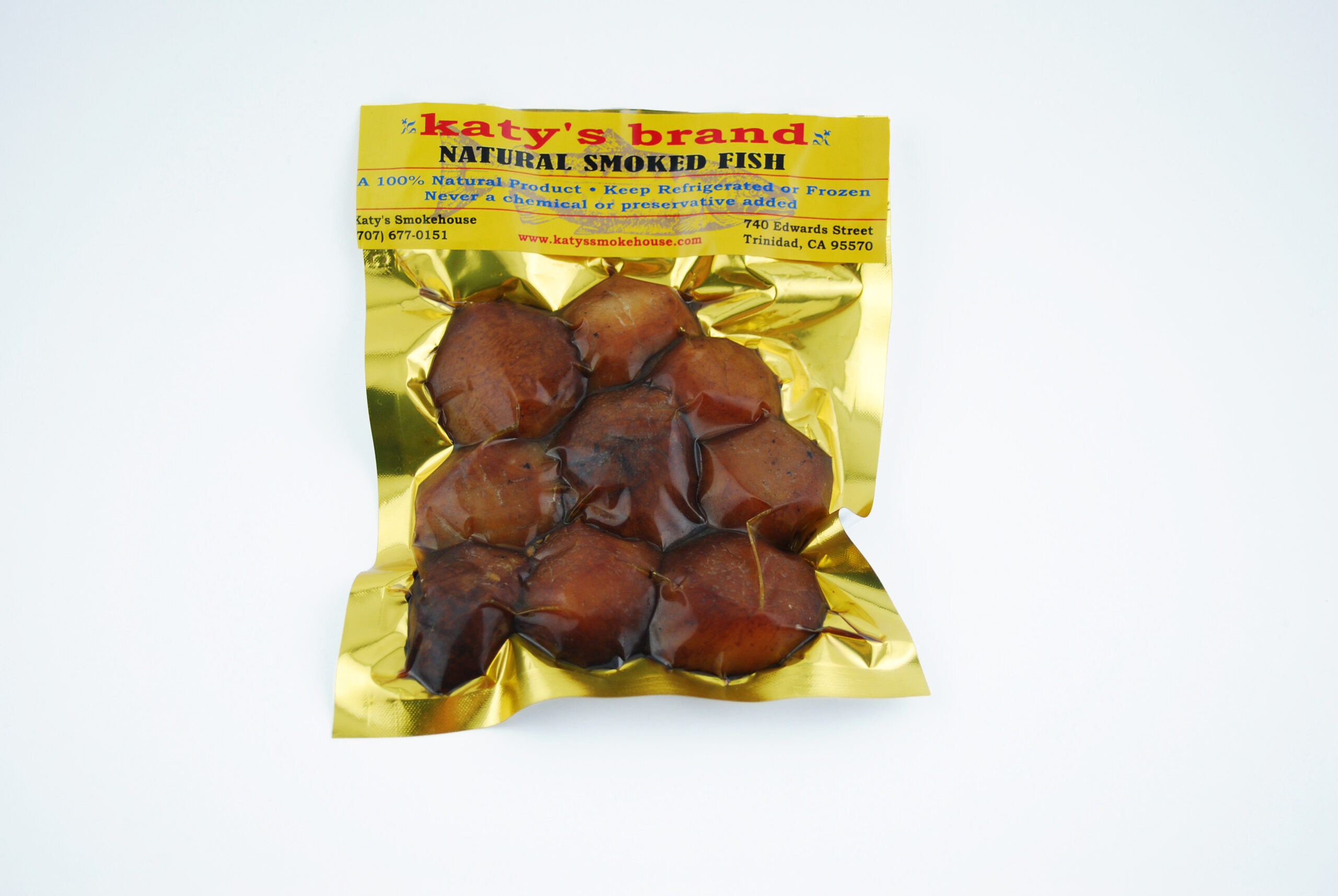 Katy starts with a large dry boat scallop (NO tri poly phosphate added!) and slowly smokes them to produce a golden, rich but delicate taste. Great to eat right out of the package or toss with a hot buttered pasta for a quick appetizer or main dish. Great sushi item! 6oz.